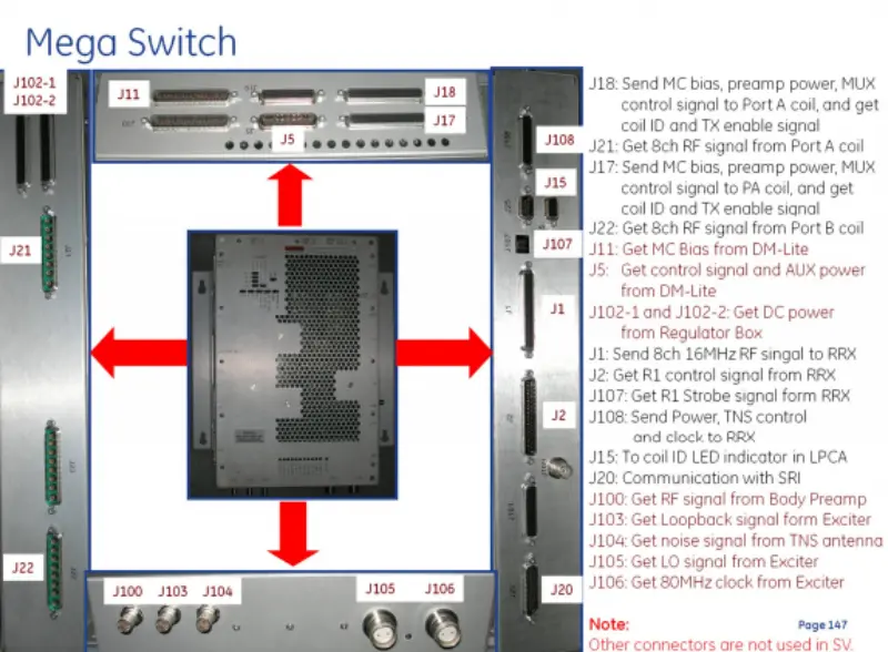 Comunicação SRI (J20): permite a troca de dados com entradas de sinal externo SRI (J100, J103-J106): recebe sinais de RF do pré-amplificador corporal, sinais de loopback do Exciter, sinais de ruído da antena TNS, sinais LO e clock de 80 MHz do Exciter